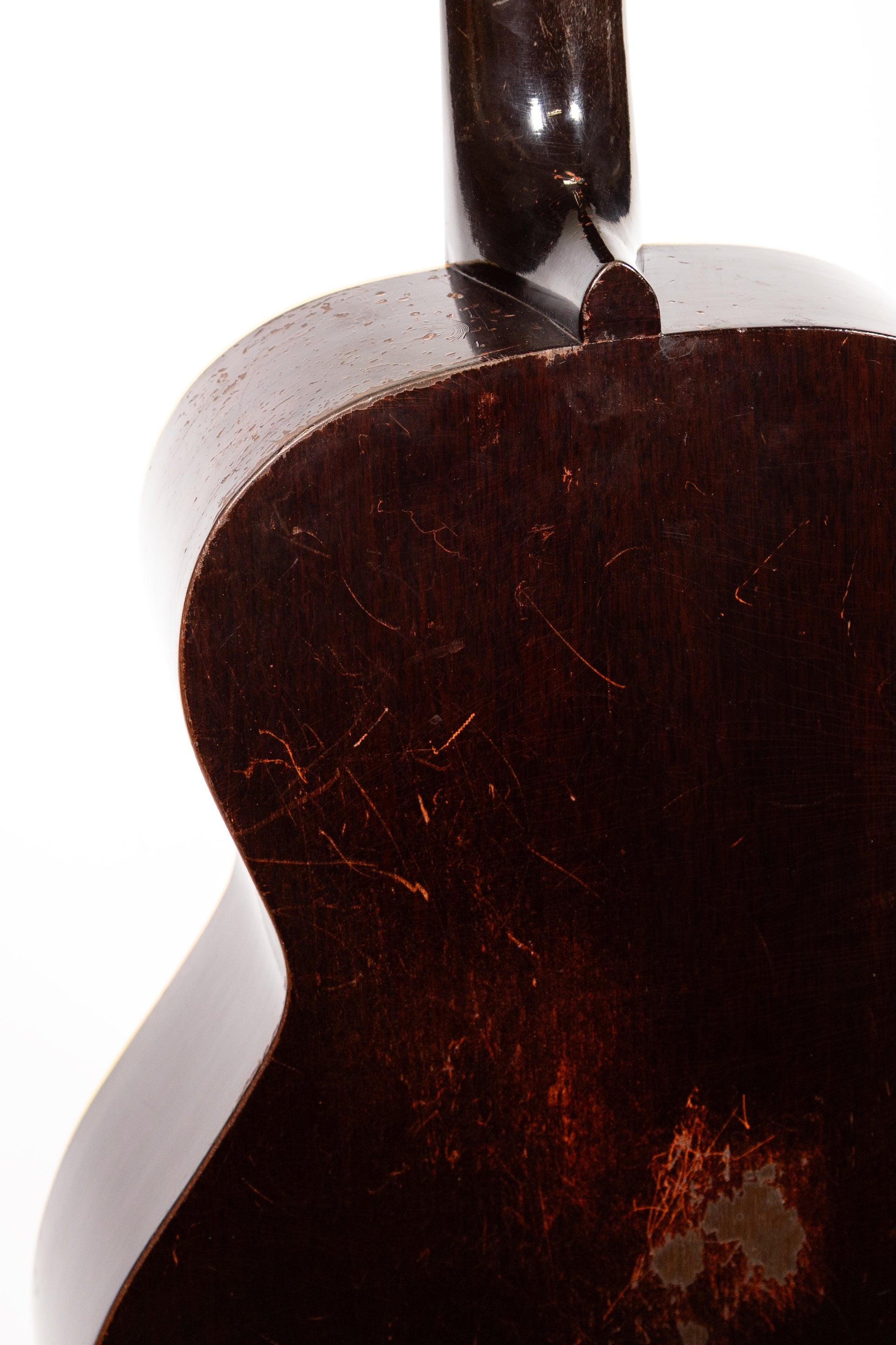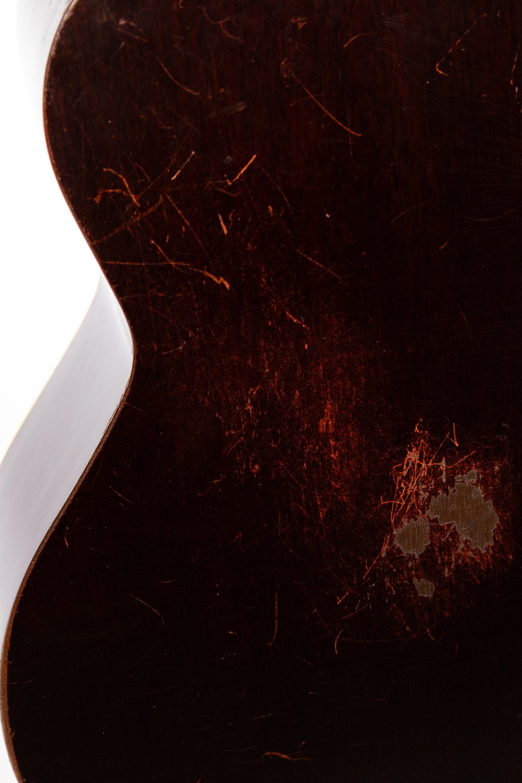 This L-00 shows the natural wear, patina and lacquer checking expected of a genuine pre war instrument, with some particularly characterful play wear to the top. It has previously had a neck reset, and the bridge has been reglued and appears to have been slightly sanded down at some point. The bridge plate remains original. The rear of the neck features extensive play wear, and we believe this to have been at least partly sanded back by hand.