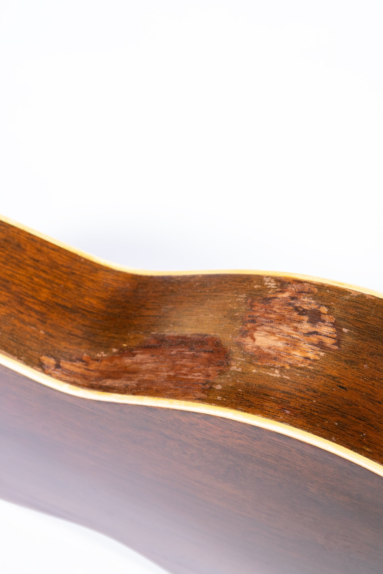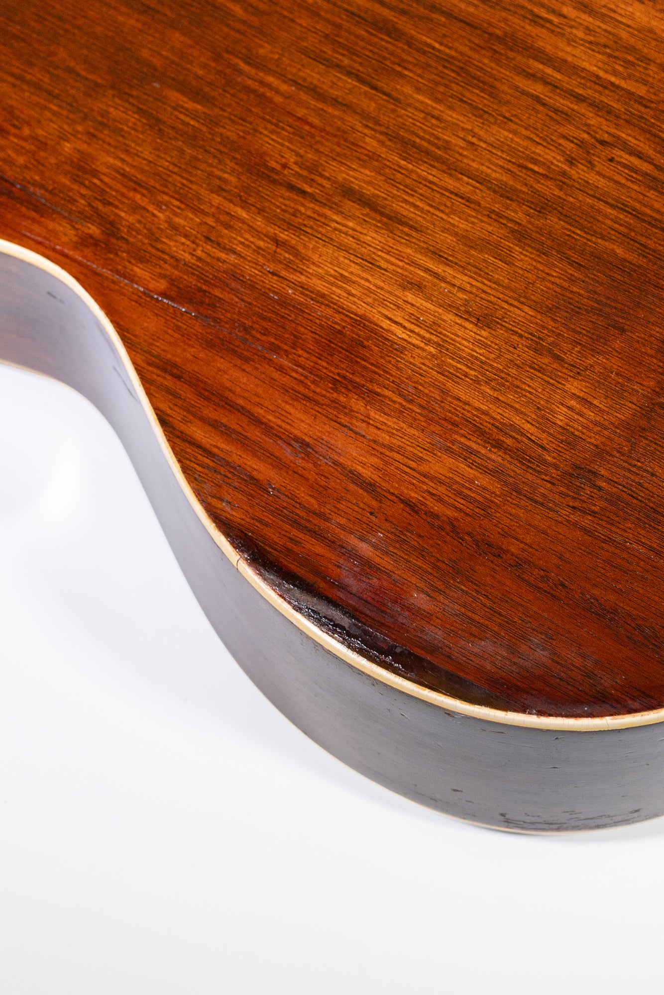 As expected from a guitar of this age, it has seen repair and maintenance over its lifetime. There have been previously repaired cracks to the top and back. The back has been stripped, there is lacquer damage to the bass side waist, and the original pickguard has deteriorated substantially. The tuners are non original replacements.