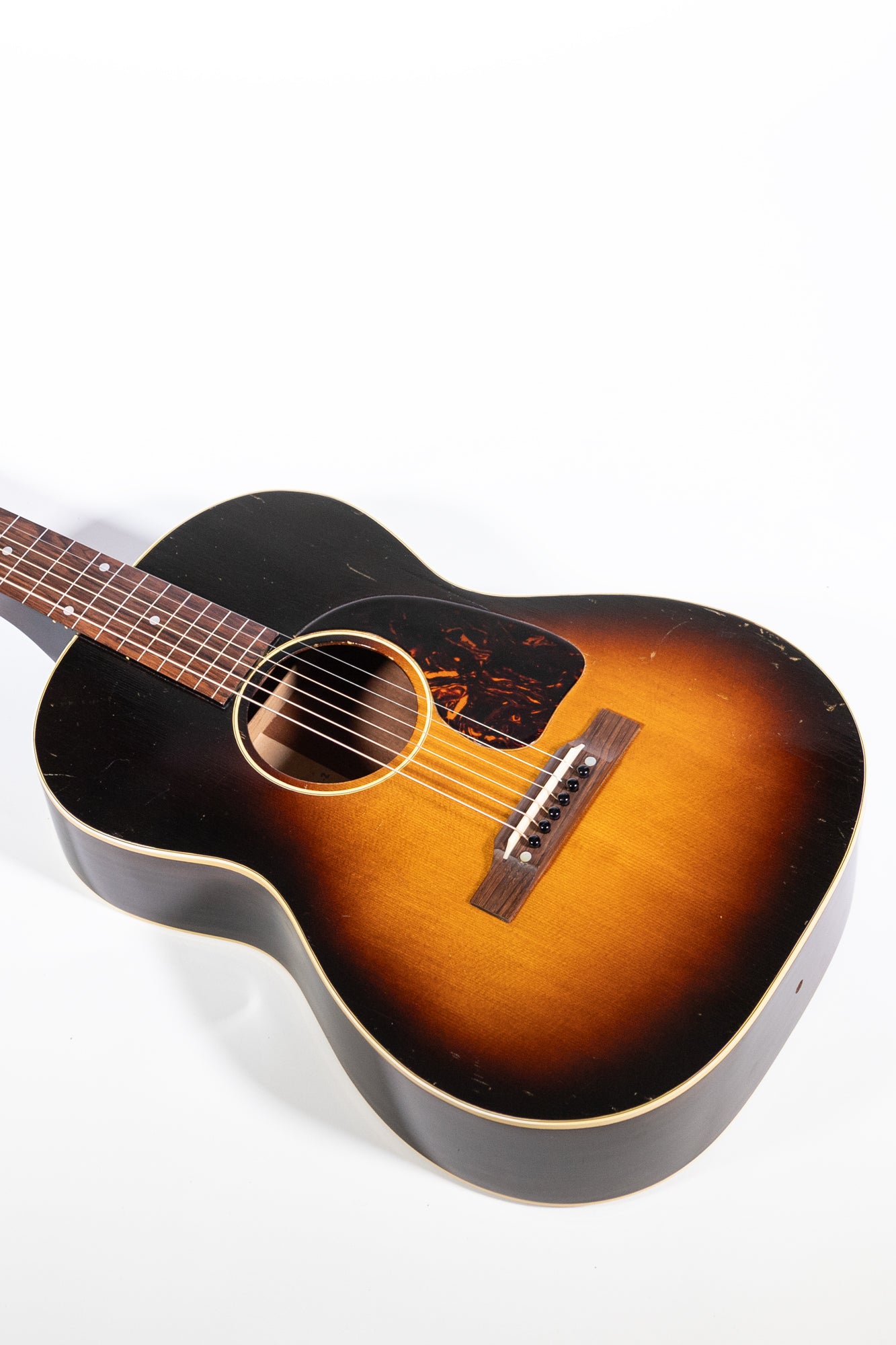 A great golden era Gibson flat top, this HG-00 is unique in the fact that it is a square neck 'Hawaiian Guitar.' These HG-00 models are largely the same construction as the LG-00 equivalent, with a Sunburst Spruce top and Mahogany back and sides. Compared to the pre war equivalent of this model, this 1948 HG-00 has a wider body shape, more similar to that of an LG-2. The square profile neck is set up perfectly for slide playing, and this model in particular has an incredibly airy, resonant tone with plenty of volume.
