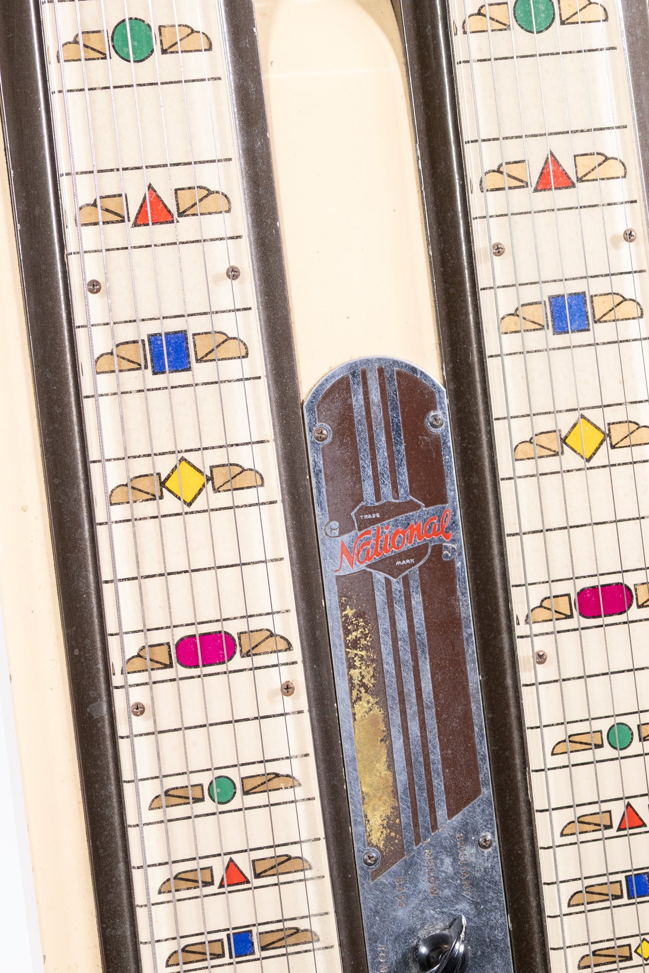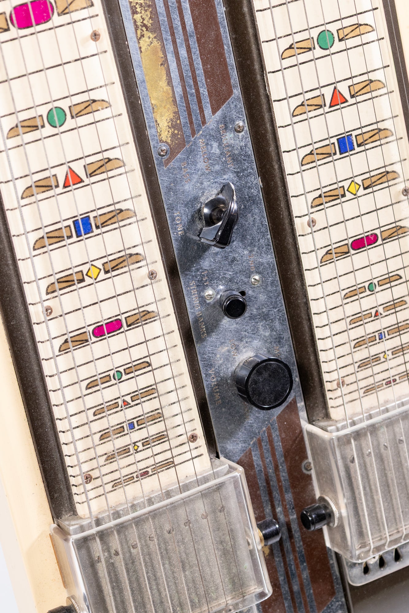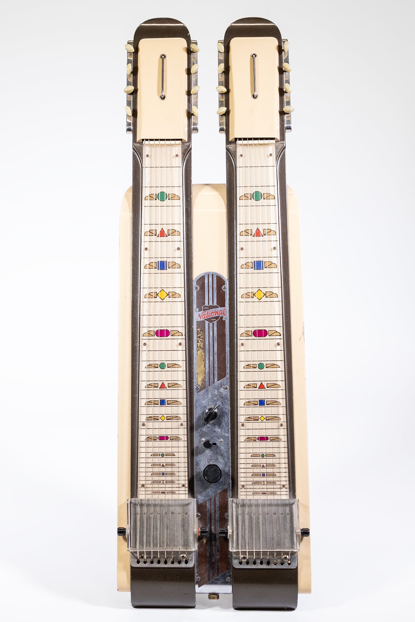 National have long been revered as some of the finest instruments made both pre-war and post-war in the US, with their resonators, flat tops and lapsteels synonymous with the Americana styling of that Mid-Century period. 1950 National Model 1050 Grand Console double eight-string lap steel was built by Valco in the postwar period as part of the Dynamic series. It features a twin-body design with two eight-string necks finished in cream lacquer. Each neck is fitted with a back-painted Lucite fingerboard marked with coloured art deco style position markers.