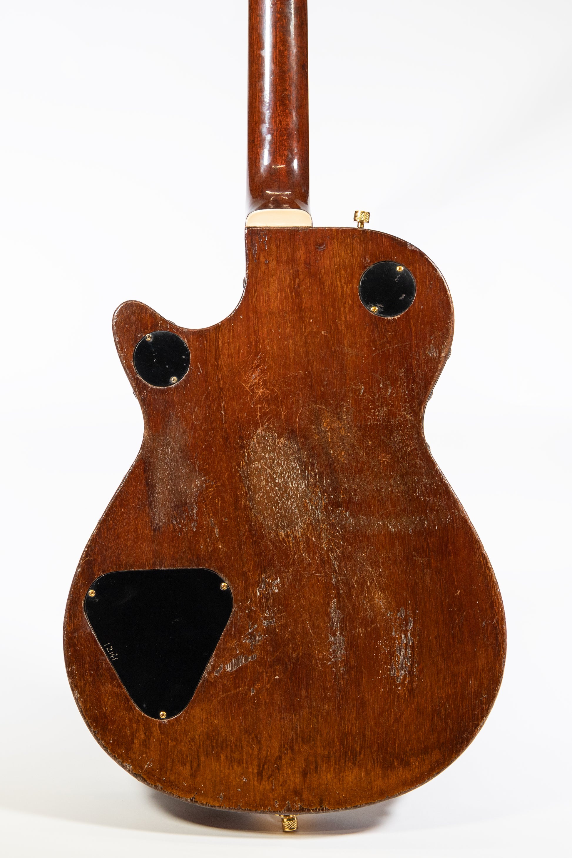 This guitar has sustained a number of repairs and modifications over the course of its life. The neck has previously been reset, and it has undergone heat treatment to correct the neck. Areas of binding have been repaired. The tuners and Melita bridge are both later. The top has been relacquered at some point. Some of the hardware has been re-plated. The pickup covers and bridge base have at some point been glued to the top. This guitar also includes its original tweed covered case.