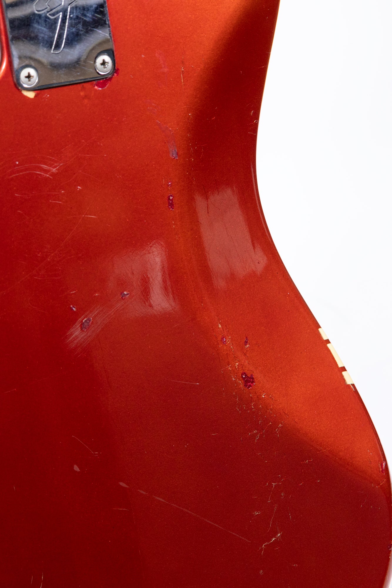 This guitar is a superb example of the Competition series Mustangs produced between 1969 and 1973, offered in Orange, Red and Blue (referred to as Burgundy in Fender catalogues), each finished with the signature racing stripe. The Competition Red finish has aged nicely over the years, with an almost burnt orange look in some lights due to the red lacquer fading out over time, along with the matching headstock seen on early examples.