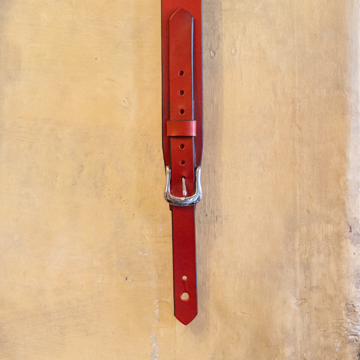 1 and 3/4 Inches wide and 58 Inches long, red hand-tooled leather with a nickel buckle.