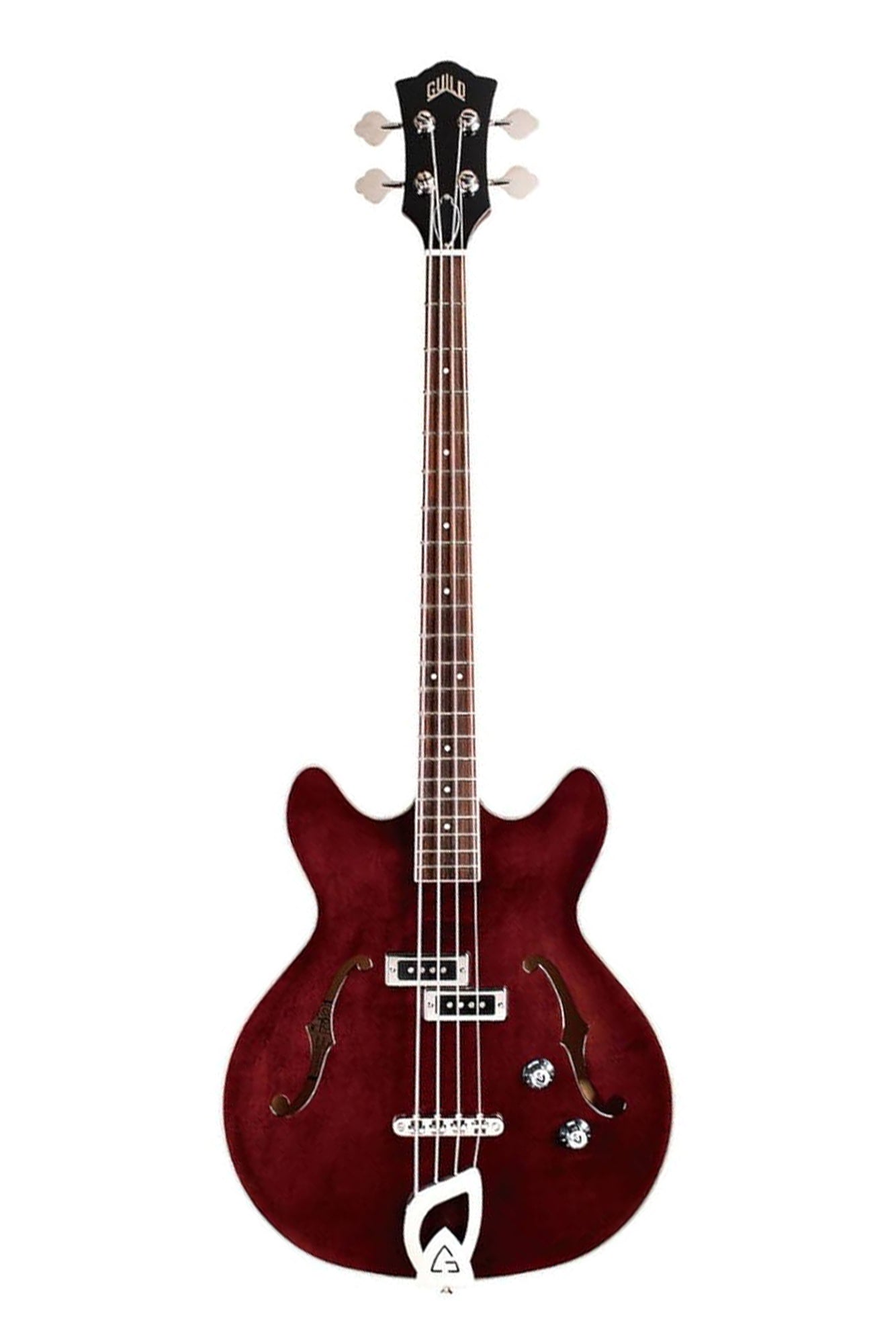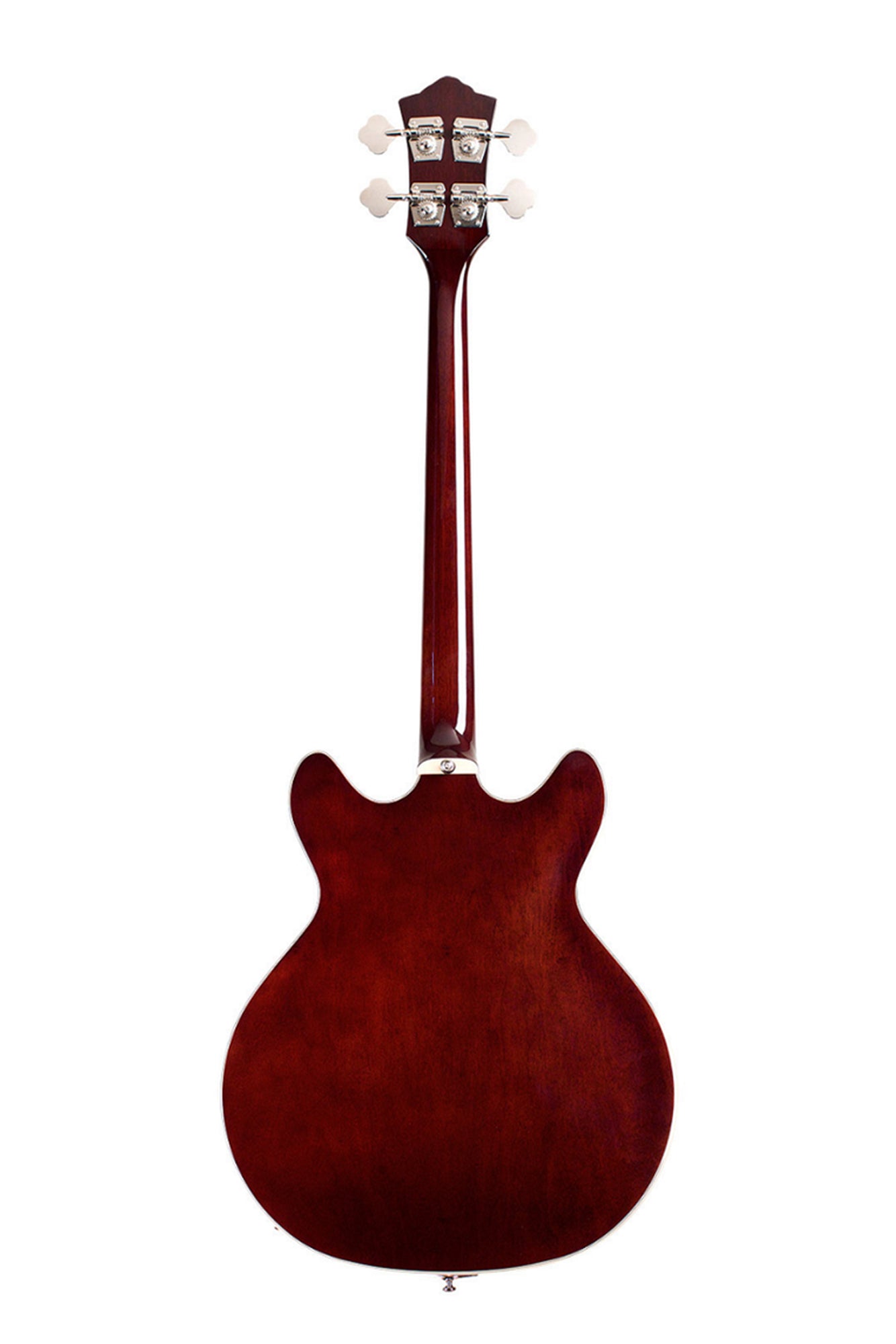 Ensuring tuning stability and easy adjustments, the Tune-o-matic bass bridge takes center stage, complemented by the Guild harp tailpiece that pays homage to the bass's upright predecessors. Elevating your sonic possibilities, Guild’s BC-1 BiCoil pickups feature hum-resistant nickel covers and Alnico 5 magnet construction. Blend the semi-hollowbody's organic resonance with volume and tone controls, sculpting a wide tonal spectrum from contemporary sharpness to vintage warmth.