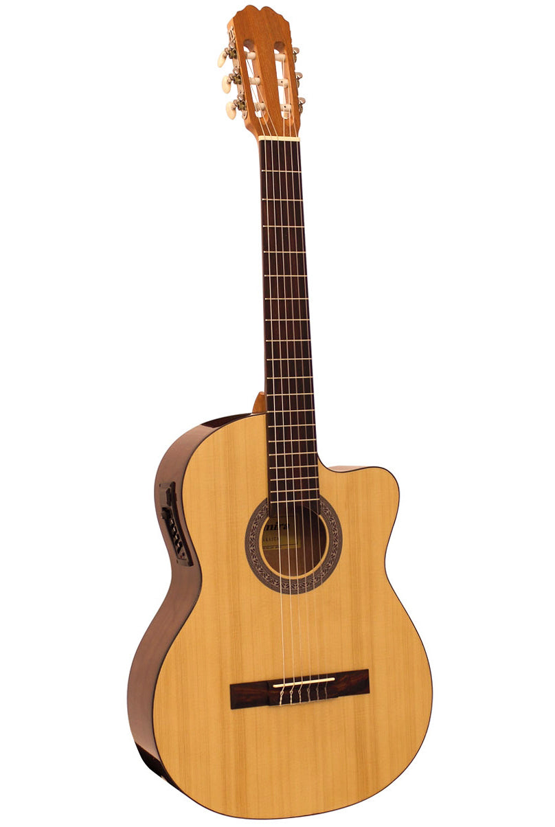 The Admira Sara is the perfect student model for players looking for a full body sized cutaway nylon string with a built in pickup. The Sara features a Spruce top with Walnut back and sides and a sleek gloss finish.